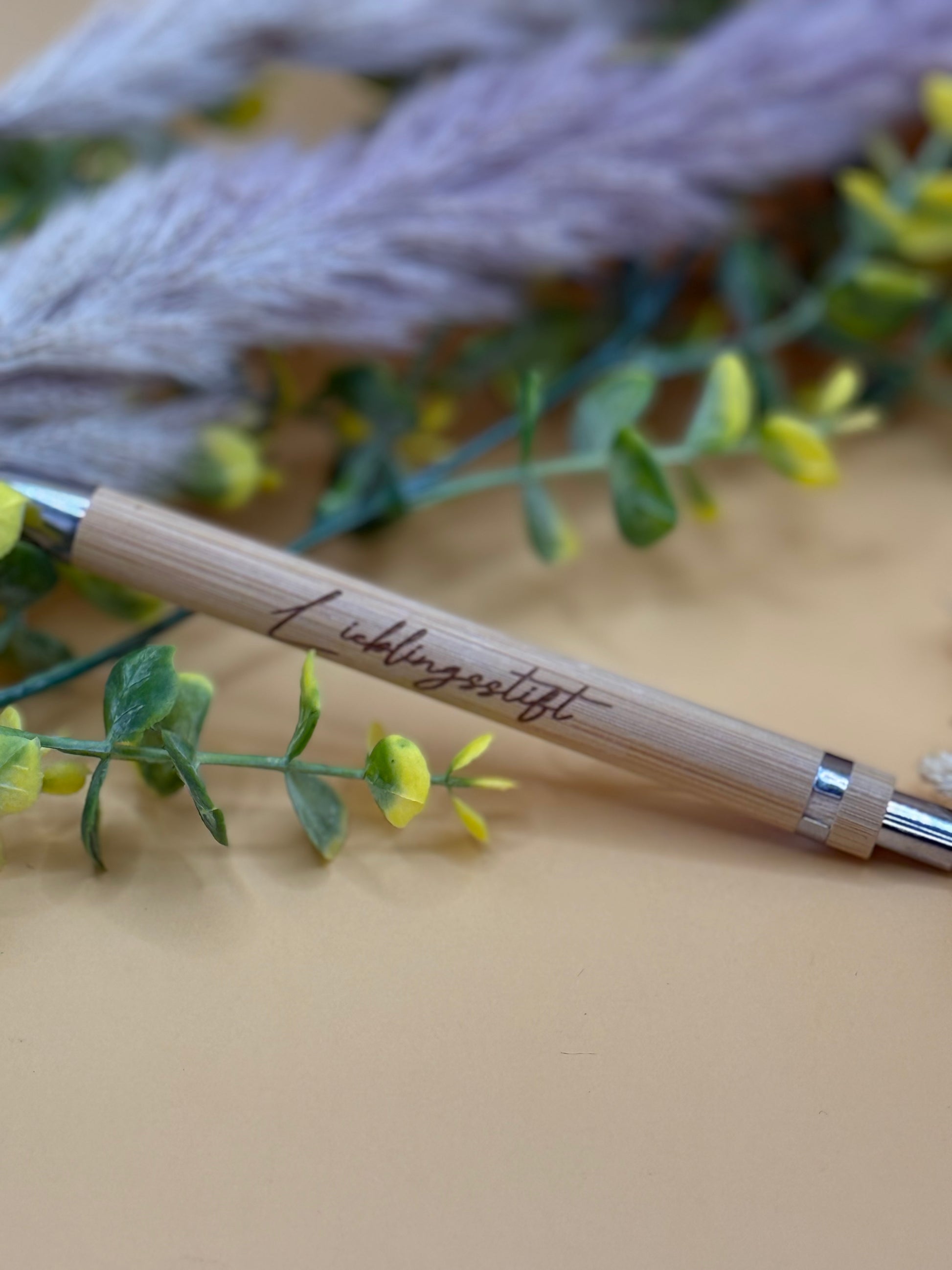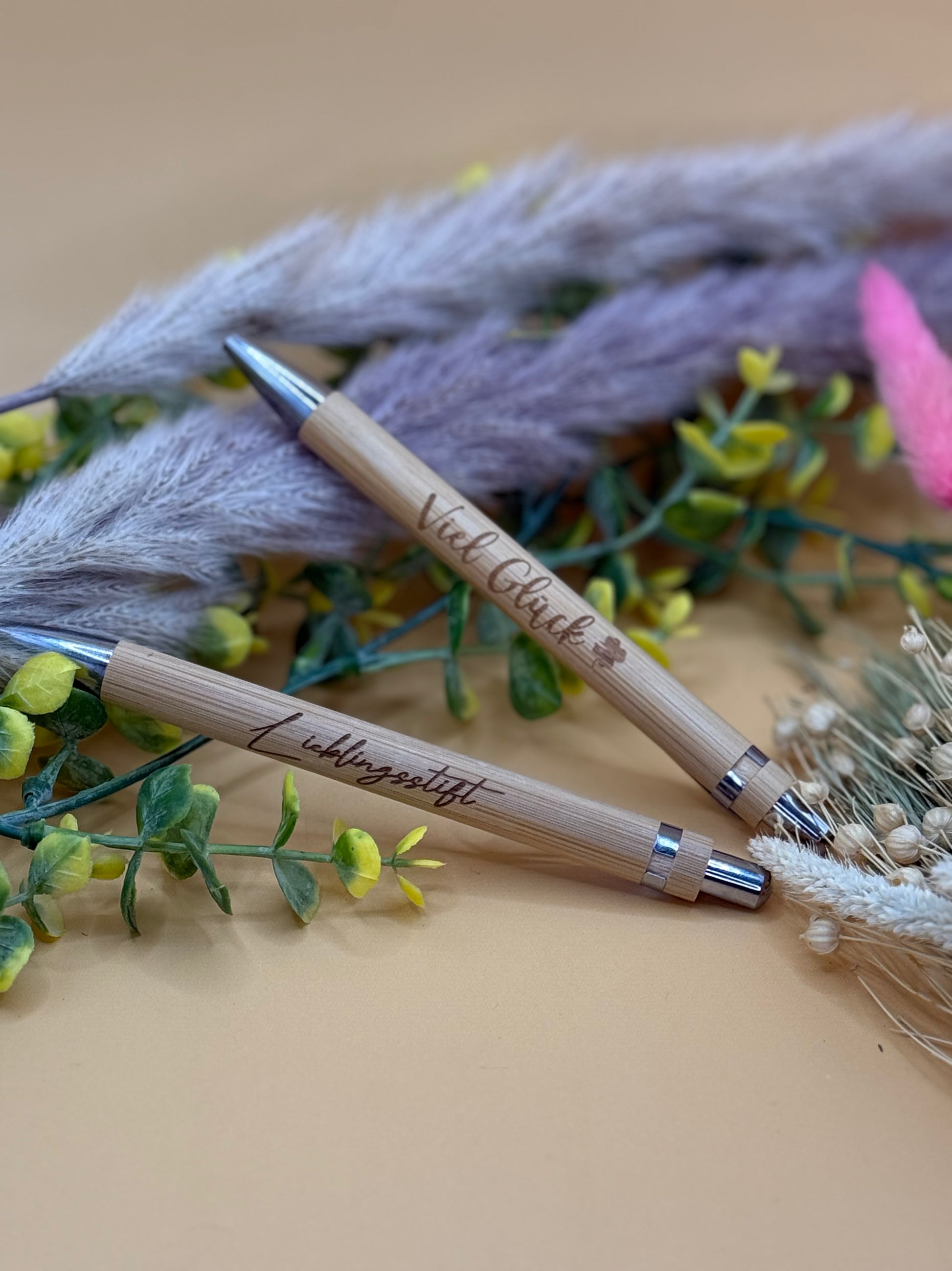 Echter Holzgriff, feine Lasergravur und zwei Designs zur Auswahl: „Lieblingsstift“ (weil’s einfach stimmt) oder „Viel Glück“ (für alle, die’s brauchen können ).