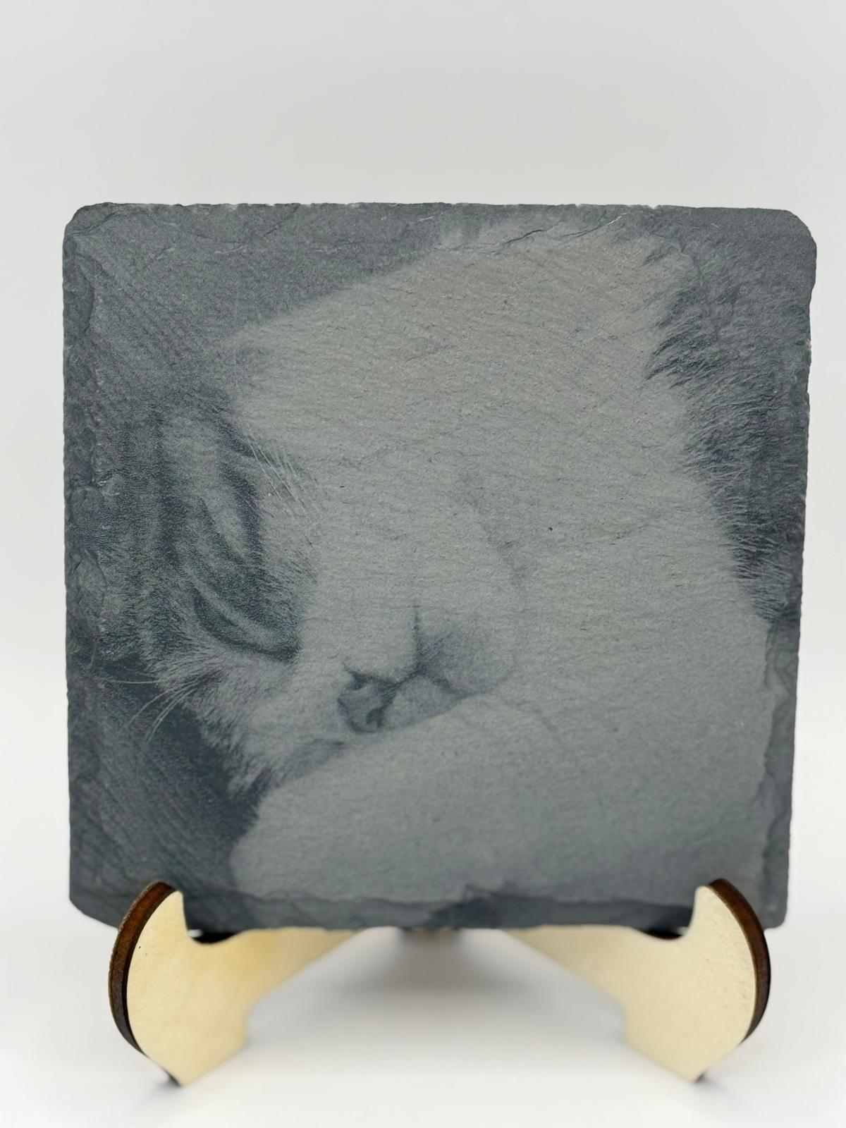 Schick uns dein Lieblingsfoto, und wir zaubern daraus ein edles, lasergraviertes Kunstwerk auf echter Schieferplatte. Ob für Oma, den Hund oder dich selbst in heroischer Pose – alles ist möglich. Präzise gelasert, langlebig und garantiert cooler als jedes 08/15-Bild aus dem Möbelhaus.
